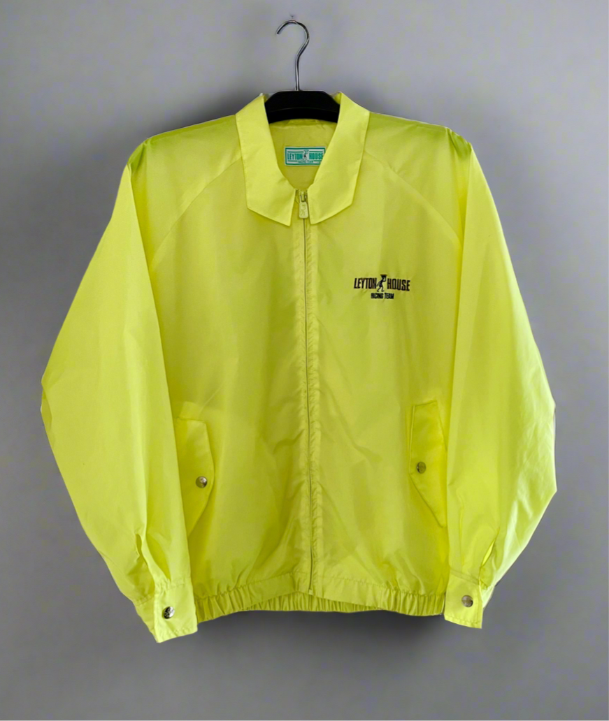 90’s lightweight jacket from the iconic Leyton house racing team. Fluro yellow, lovely and bright.  Features large back print, Embroidered chest logo. Snap fastener cuffs with logo is a great detail.