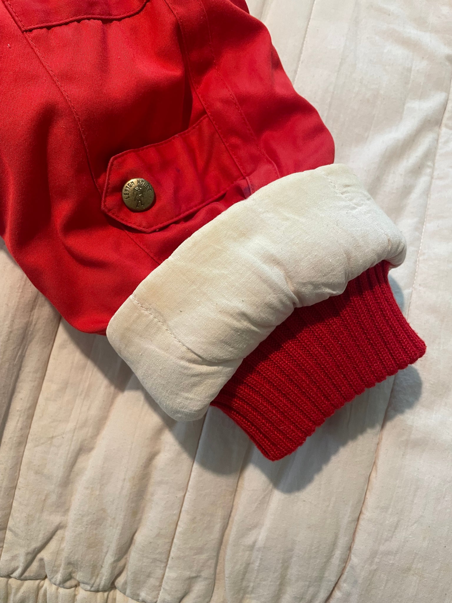 Early 90’s racing jacket from the iconic Leyton house team. Bright red with some lovely details. Embroidered back logo and sleeve patch. Asymmetric zip and logo stamped snap fasteners. Double cuffed and quilted to keep you warm.