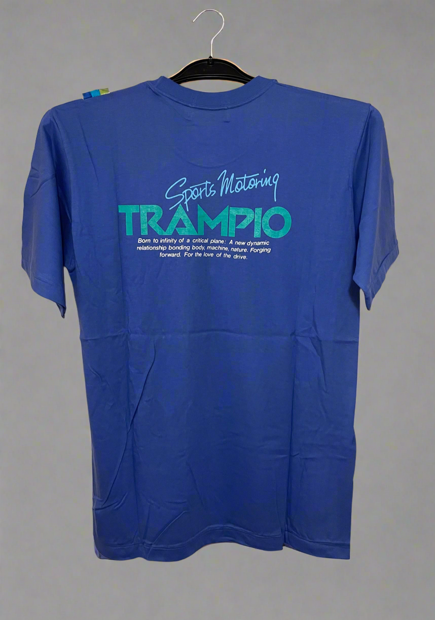 90’s / 00’s TRAMPIO tyres t shirt in blue featuring large chest and back print along with tri colour tab shoulder tab.