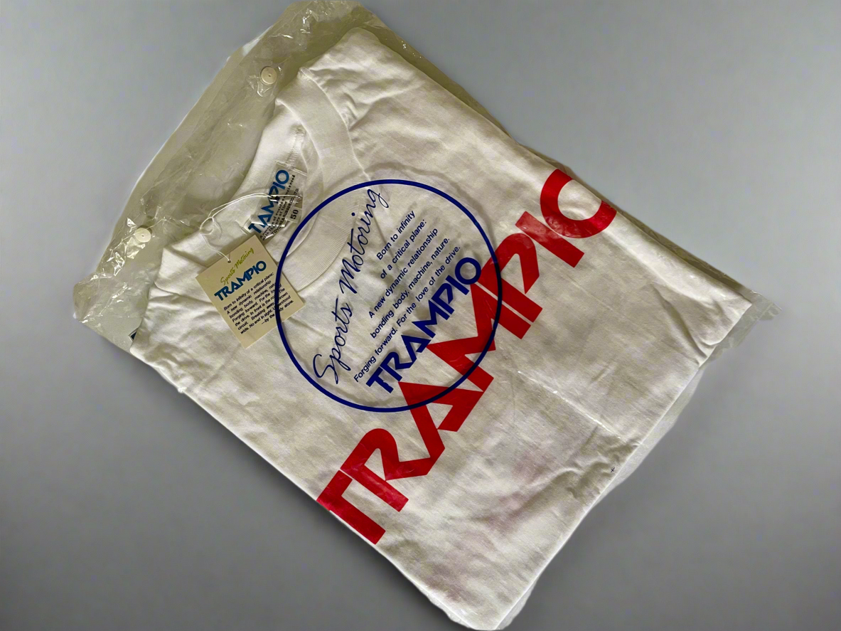 90’s / 00’s TRAMPIO tyres t shirt in white featuring large chest and back print along with tri colour tab shoulder tab.