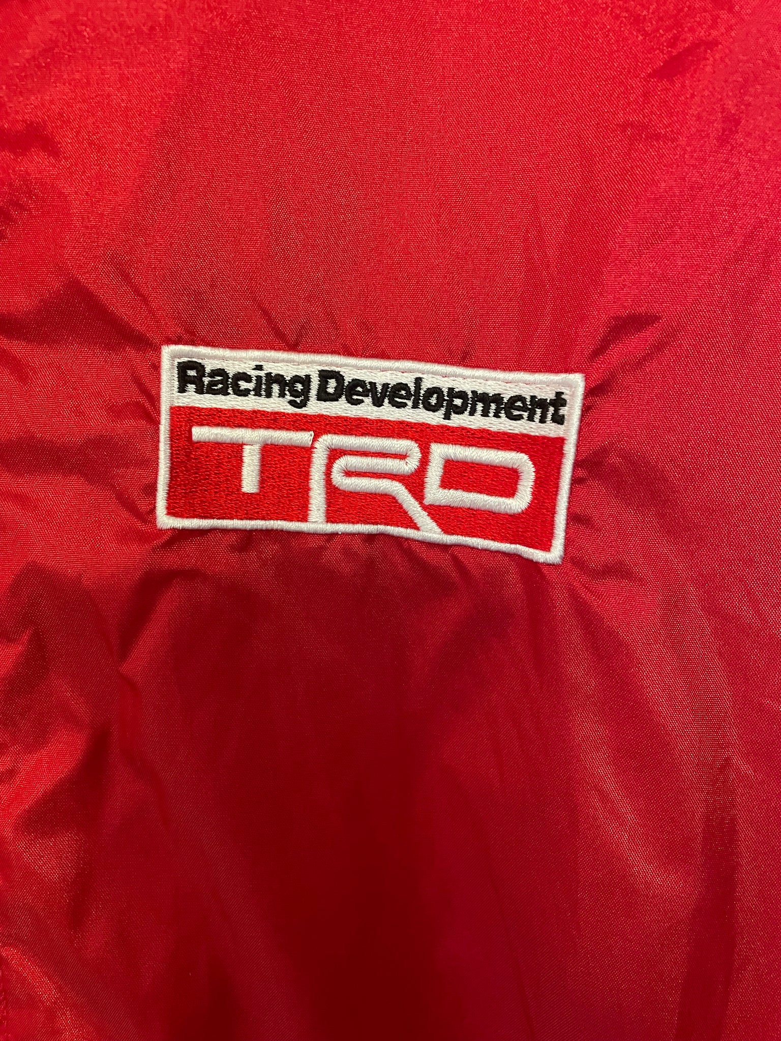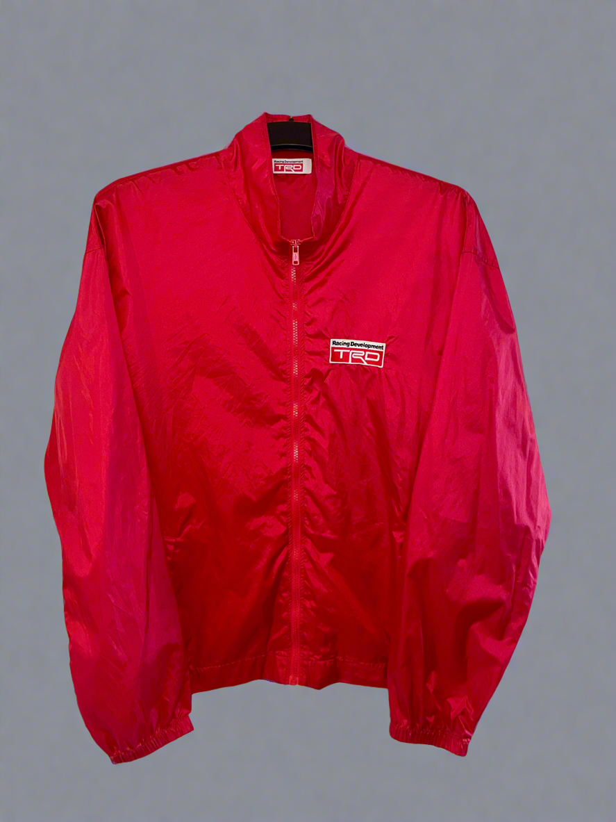 Lightweight TRD jacket in red. Features large TRD logo back print that is still in great shape. Embroidered chest logo. Elasticated cuffs and back vent.